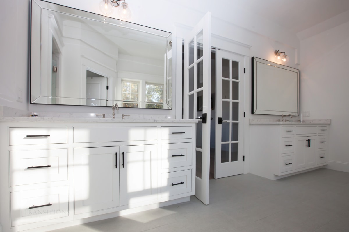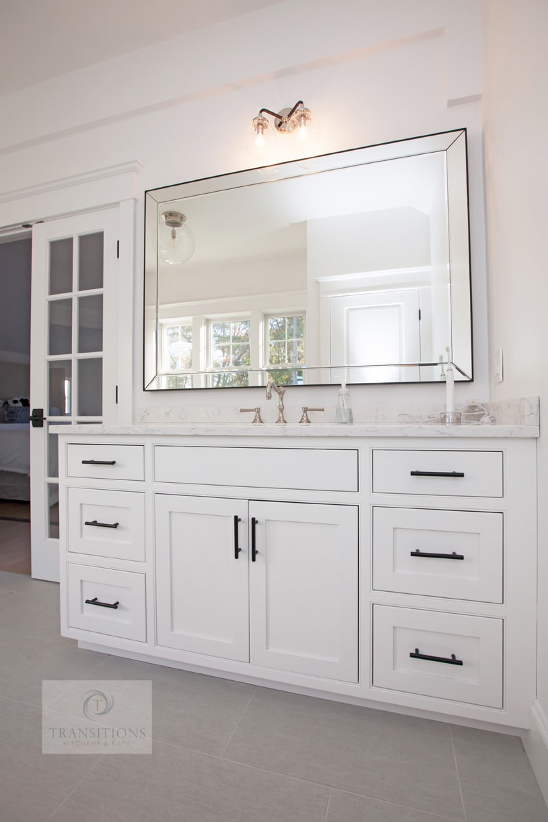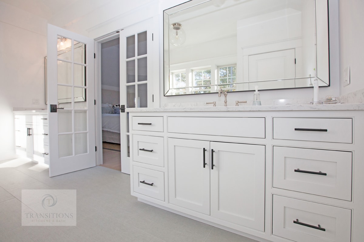 French doors lead from the master bedroom to this master bathroom, and create an open, airy space . The traditional style bathroom design includes two white Mouser Centra vanity cabinets accented by black Top Knobs hardware. Above each cabinet sits a large beveled mirror topped by a wall sconce for targeted lighting. The vanity cabinets offer ample storage, and the bright space is an ideal setting for relaxation.